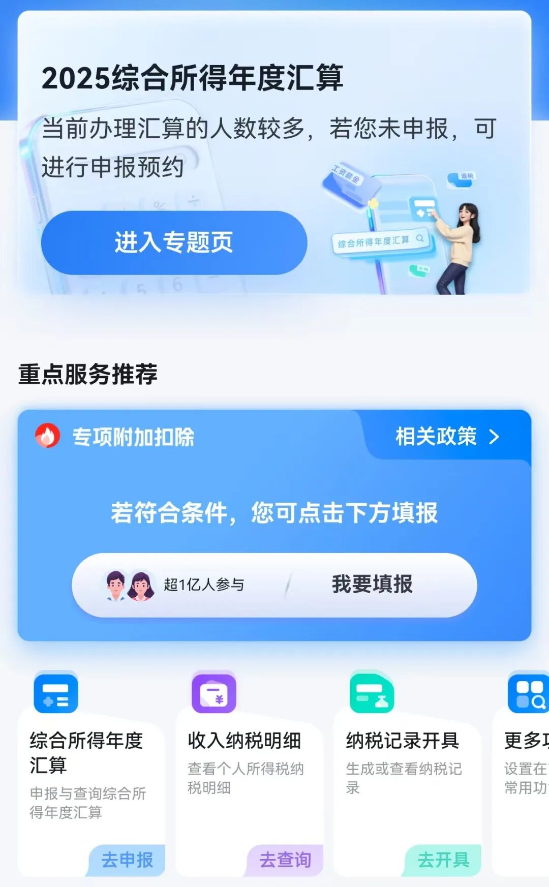 进入手机APP,首页“2025综合所得年度汇算”专区点击“进入专题页”。