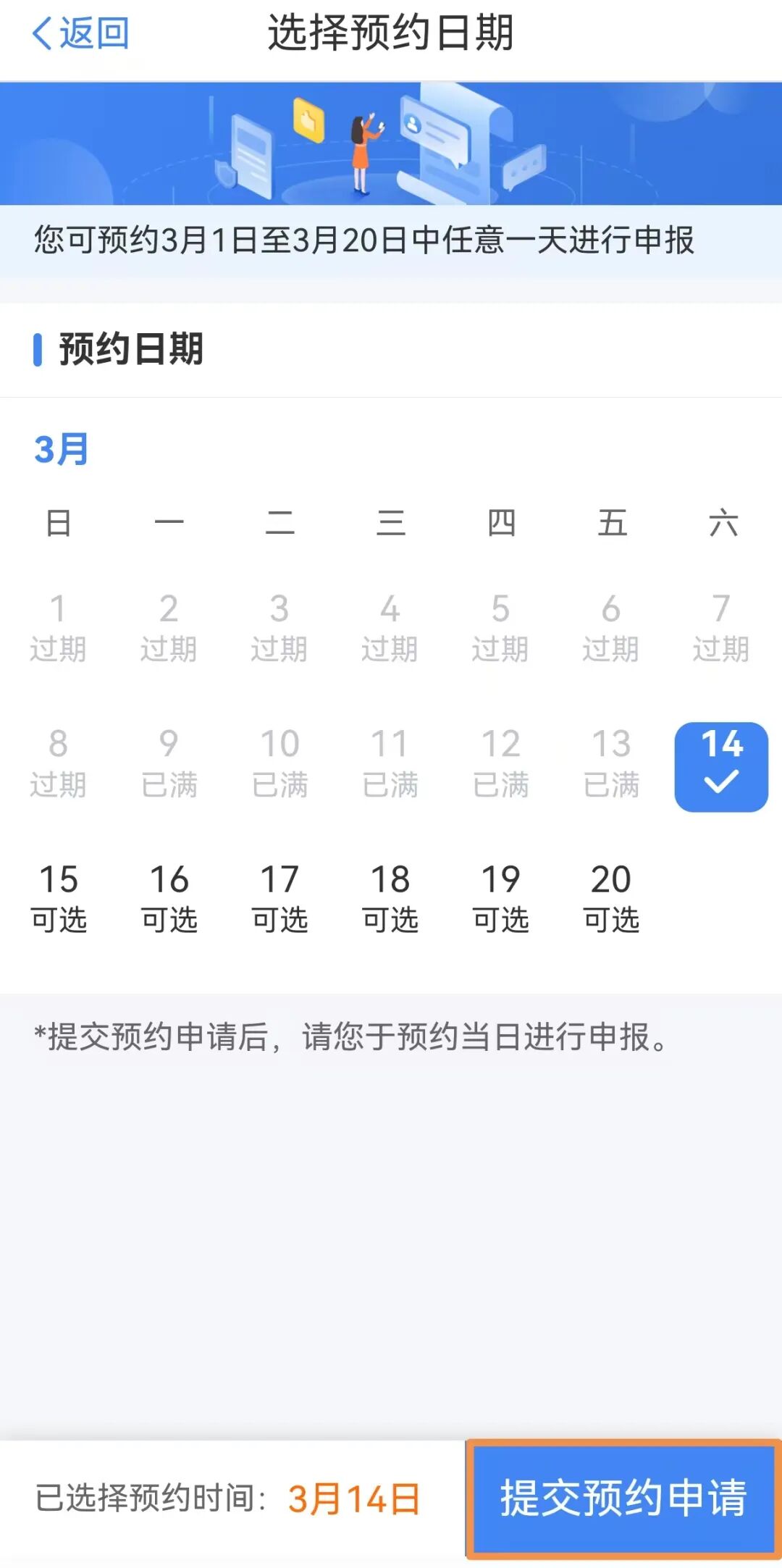 预约成功或3月20日后开始申报