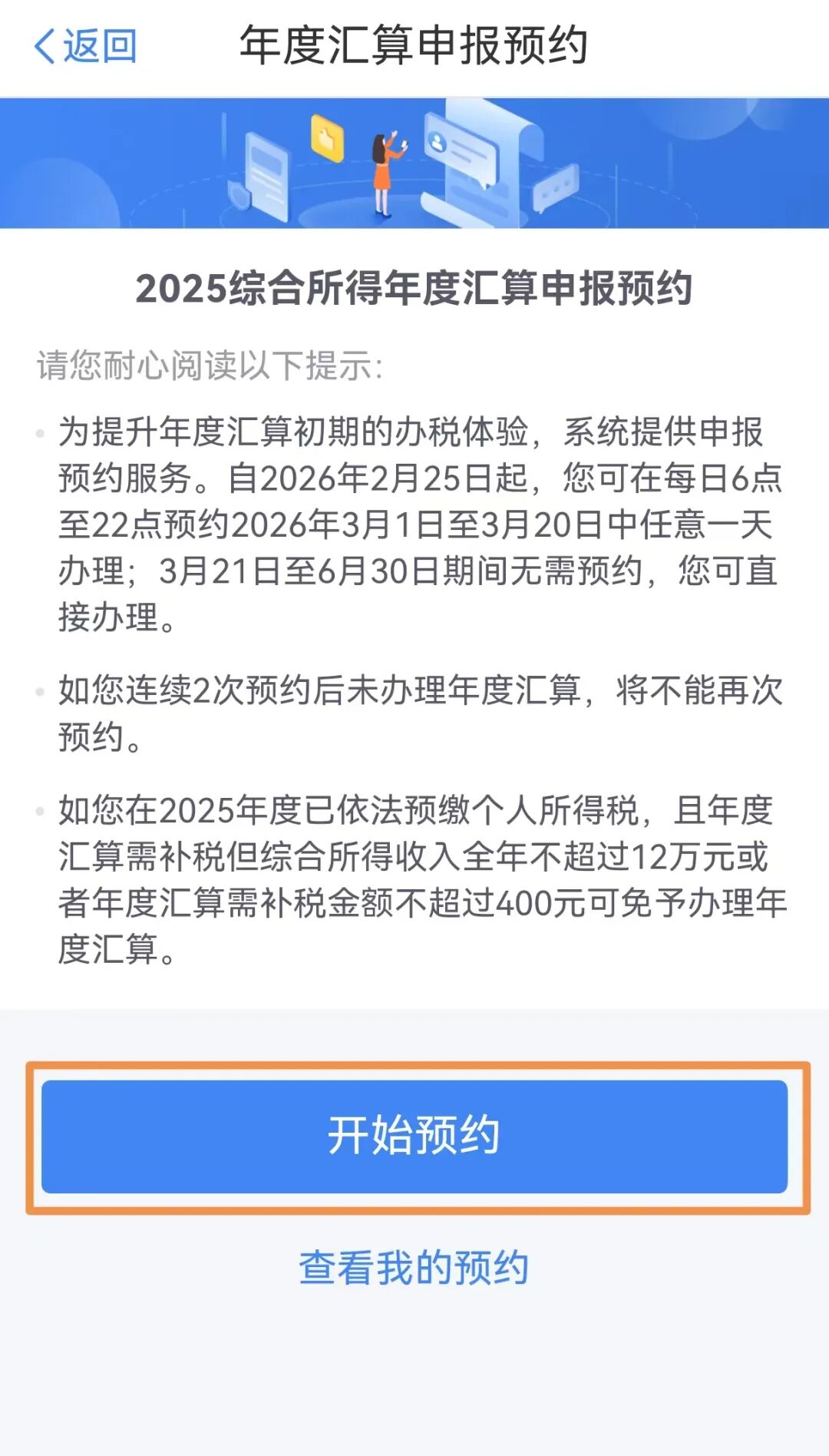 提交成功,系统提示“您已成功预约”,纳税人即可在预约日期当天办理2025年度综合所得个税汇算申报。此外,还可以在个税APP首页年度汇算专题栏查看预约情况。