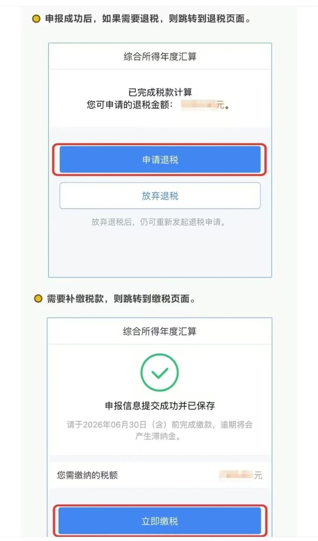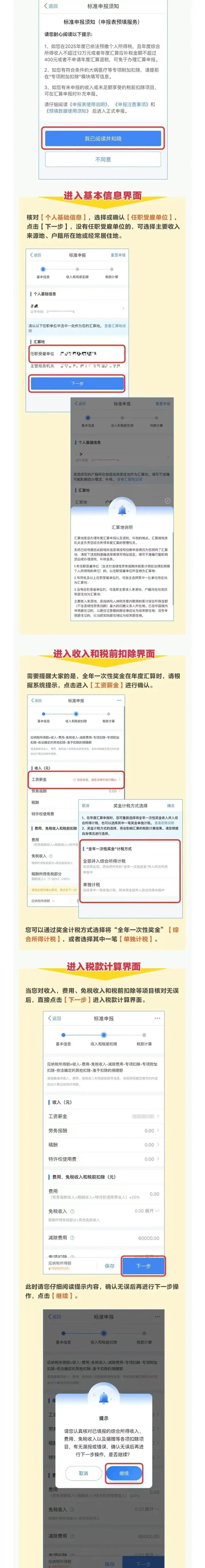 2.“全年一次性奖金”计税方式可自主选择“单独计税”或“全部并入综合所得计税”。不同的选择,应退(或应补)税额不同,请务必比较,自主选择最优惠方式。